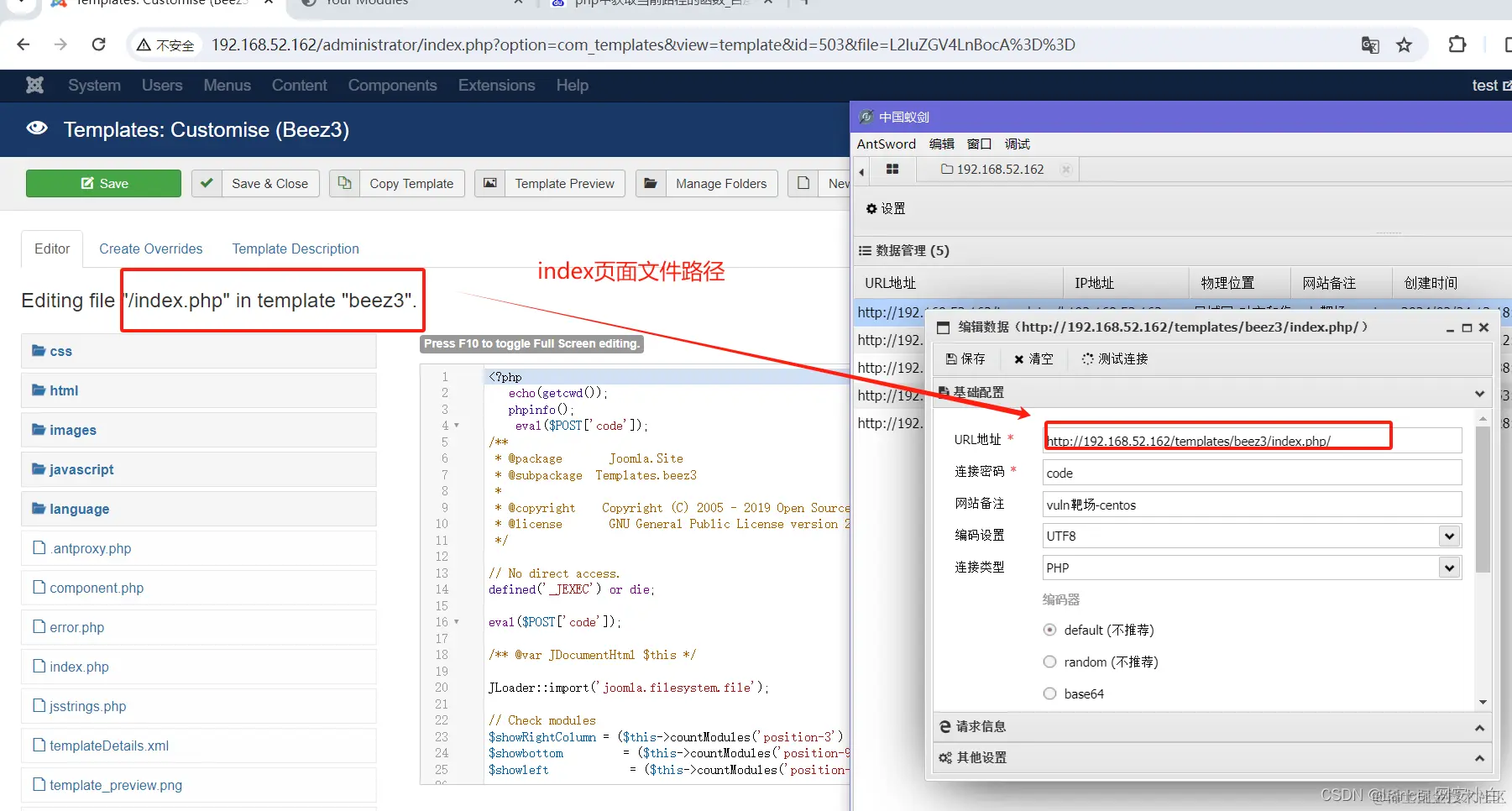 3. ### 后台登录页面,修改PHP文件,写入一句话木马,使用中国蚁剑连接