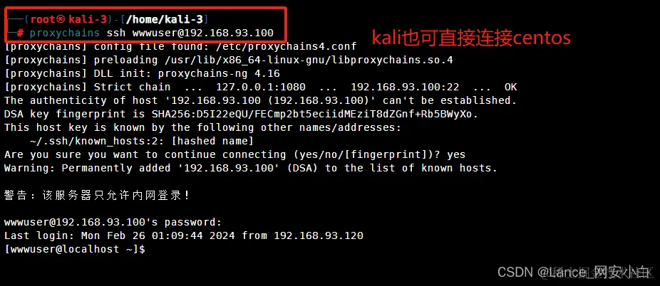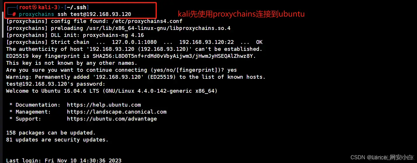 | ┌──(root㉿kali-3)-[~/.ssh]└─# proxychains ssh test@192.168.93.120 | 密码:password@123 |