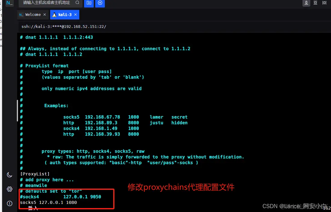 - kali配置proxychains代理配置文件--》使用代理加ssh命令连接centos成功(ubuntu发现的账号密码连接)