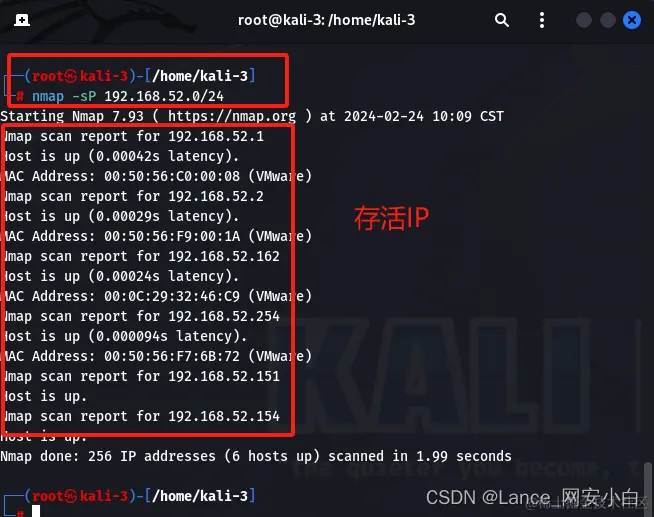 | nmap -Sp 192.168.52.0/24 | nmap使用tcp扫描存活IP |