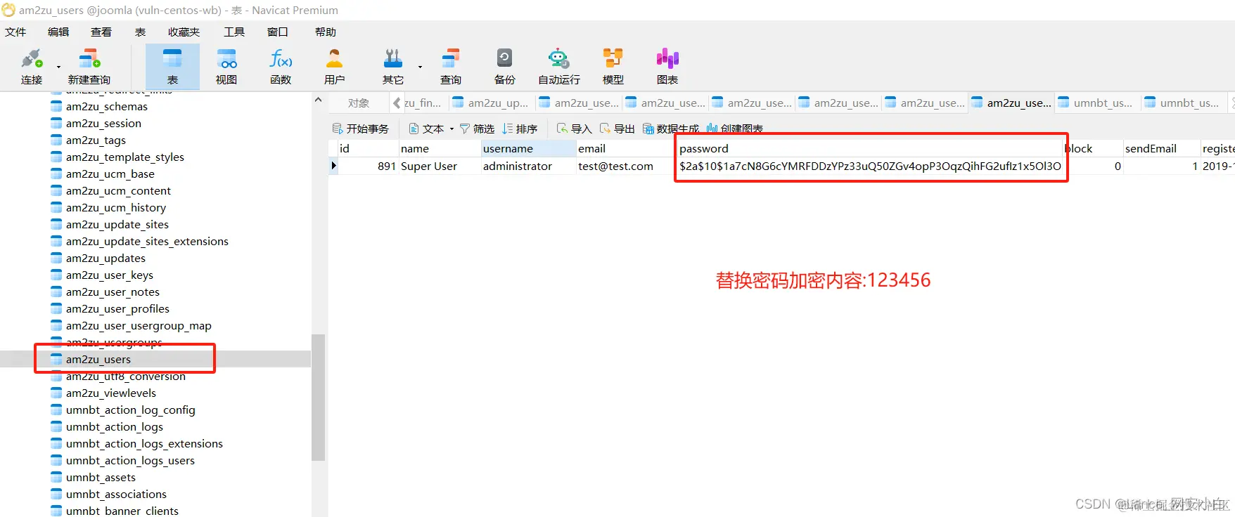 4. ##### 登录数据库后将am2zu_users表中的管理员密码信息替换,更改为123456,再利用扫描的管理员后台登录页面进行登录,成功