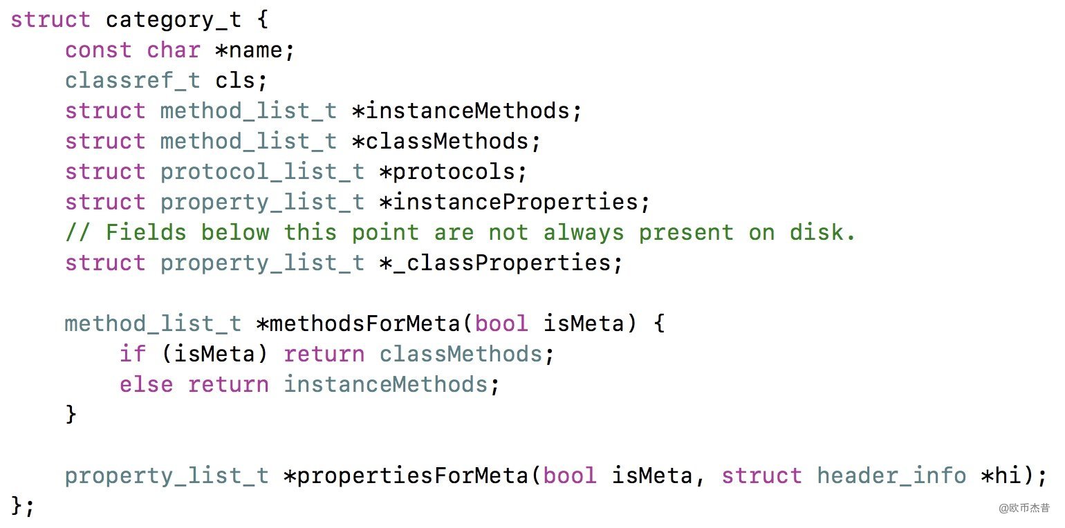 - Category编译之后的底层结构是struct category_t,里面存储着分类的对象方法、类方法、属性、协议信息