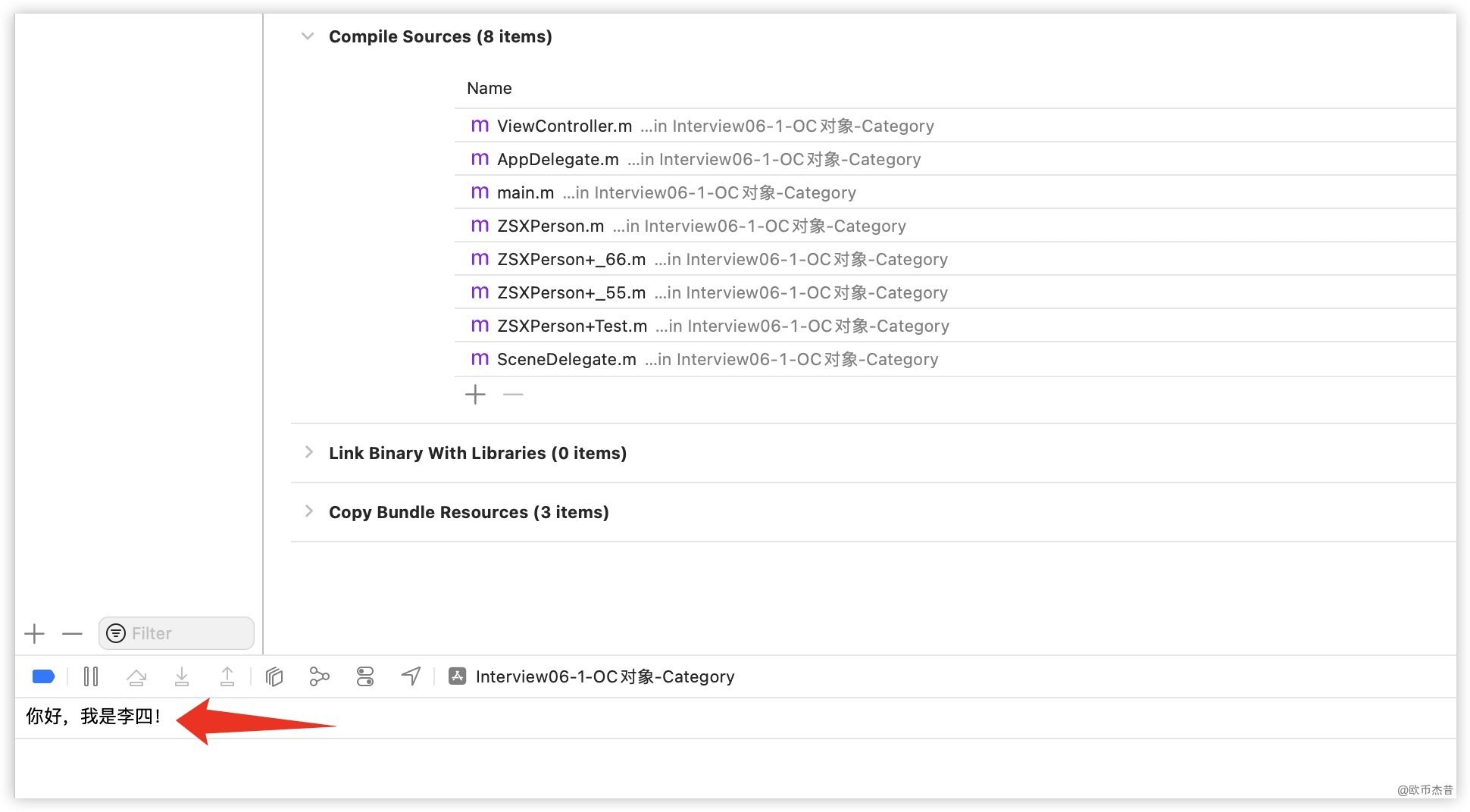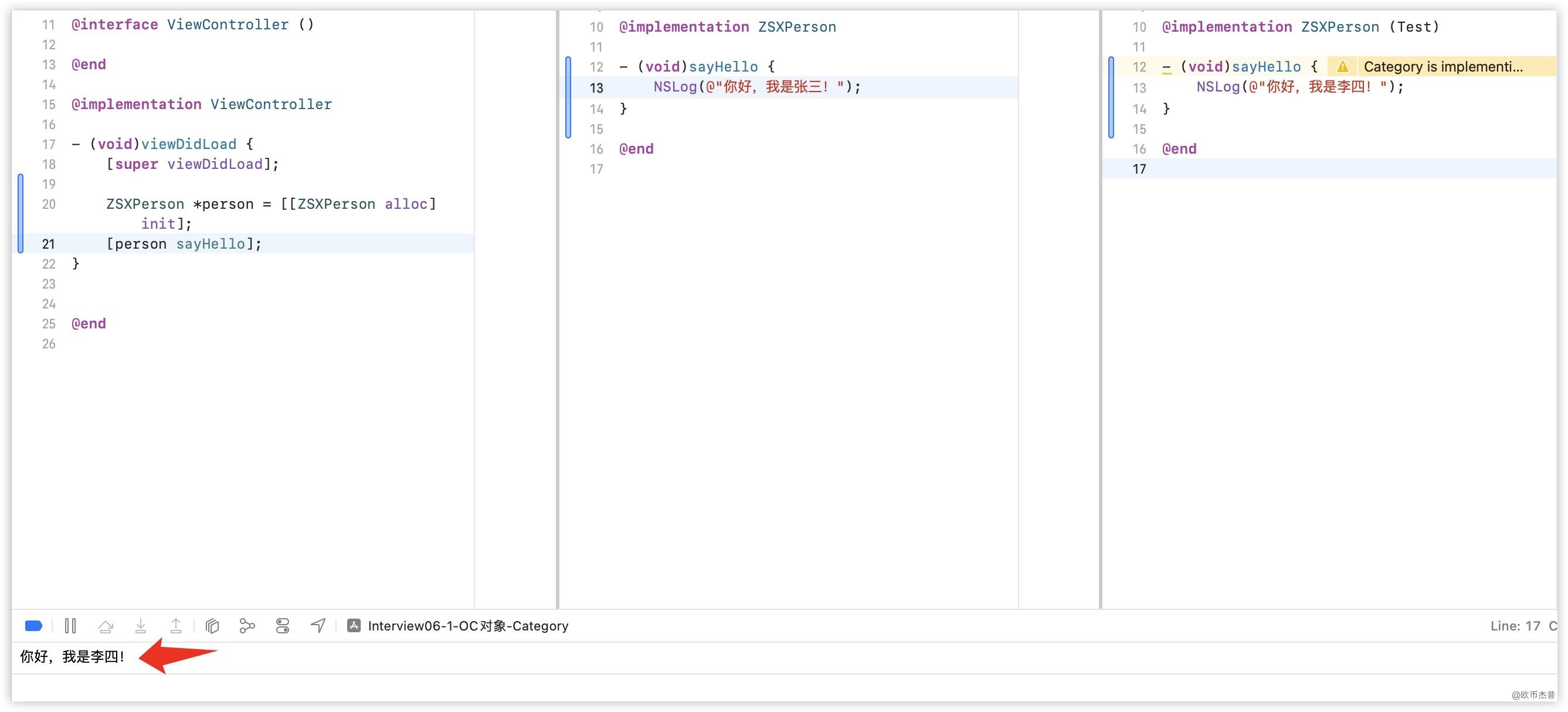 最后一个编译的类是ZSXPerson+Test,所以运行时sayHello应该要调用ZSXPerson+Test的方法实现