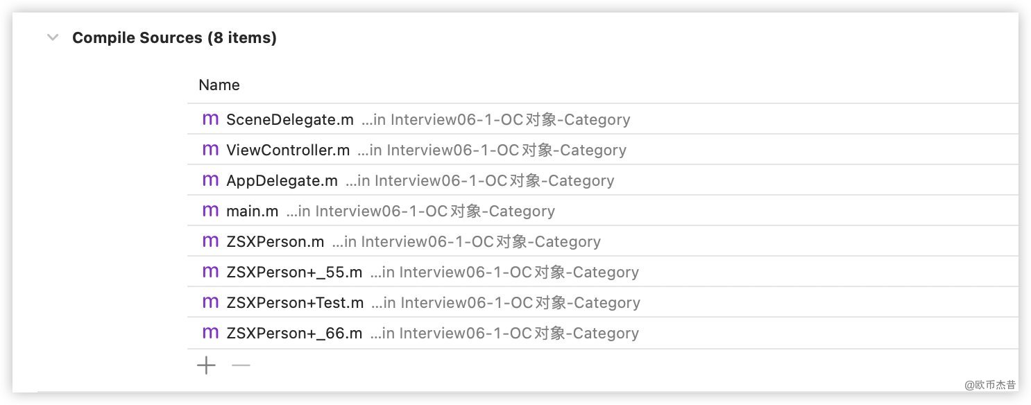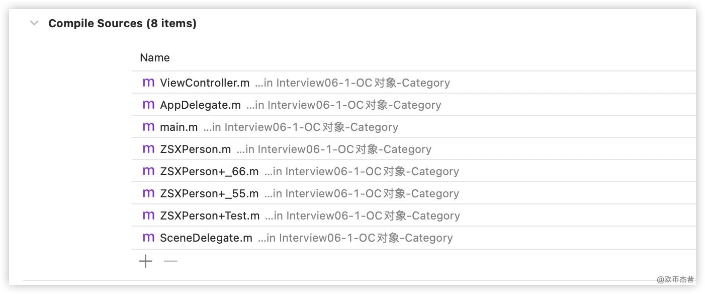 - 在程序运行的时候,runtime会将Category的数据,合并到类信息中(类对象、元类对象中)