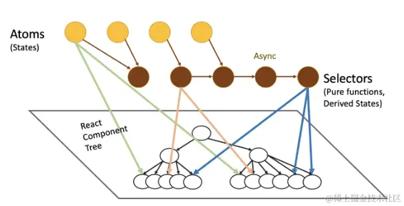 recoil的基础思想是atom数据之间没有关联,产生的关联数据全部由selector来产生,atom的变动,相关的selector随之变动,这个和响应式流的思想一致的。