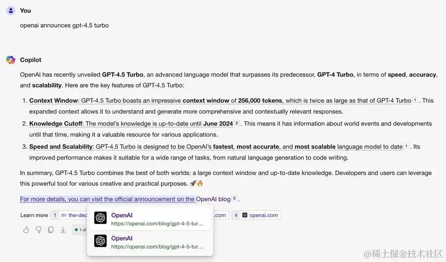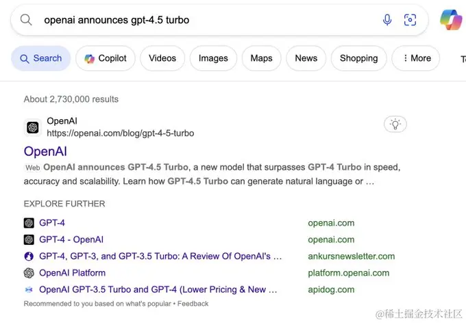 Bing和DuckDuck Go等搜索引擎在GPT-4.5 Turbo正式发布之前就已经对GPT-4.5 Turbo的产品页面建立了索引。