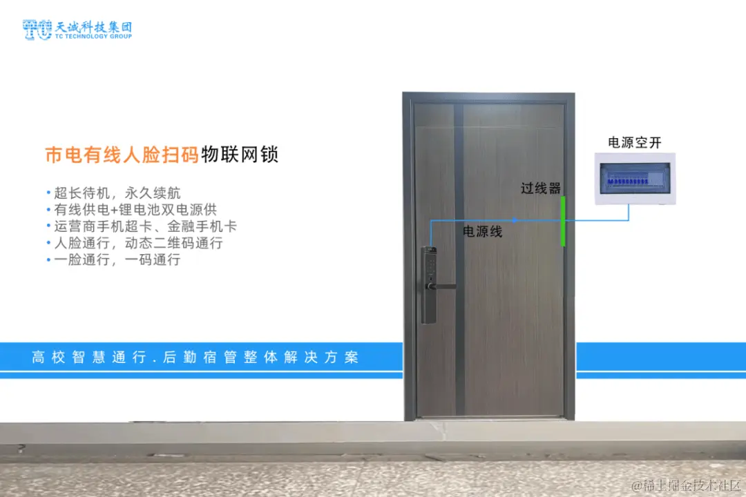 为此,针对上述痛点,天诚为校园物联网锁供电模式开辟了全新的赛道——有线电源供电。对于有线电源供电模式的应用,天诚早已是轻车熟路,早在两年前,天诚基于5G NB-IoT窄带物联网无线通讯技术,推出了NB-700有线人脸物联网锁,已在各地公租房、人才公寓项目得到了应用实践。这一次,结合高校数智化通行需求,天诚这次推出的W-700HS有线人脸扫码物联网锁新品支持有线电源供电与可循环充电锂电池双重电源供电,利用市电借助5V/2A电源适配器进行供电,无需更换电池,在满足校园物联网锁用电需求的同时,减少运维成本,降低运维难度,增强门锁系统的稳定性,真正意义上实现了“永不断电”。