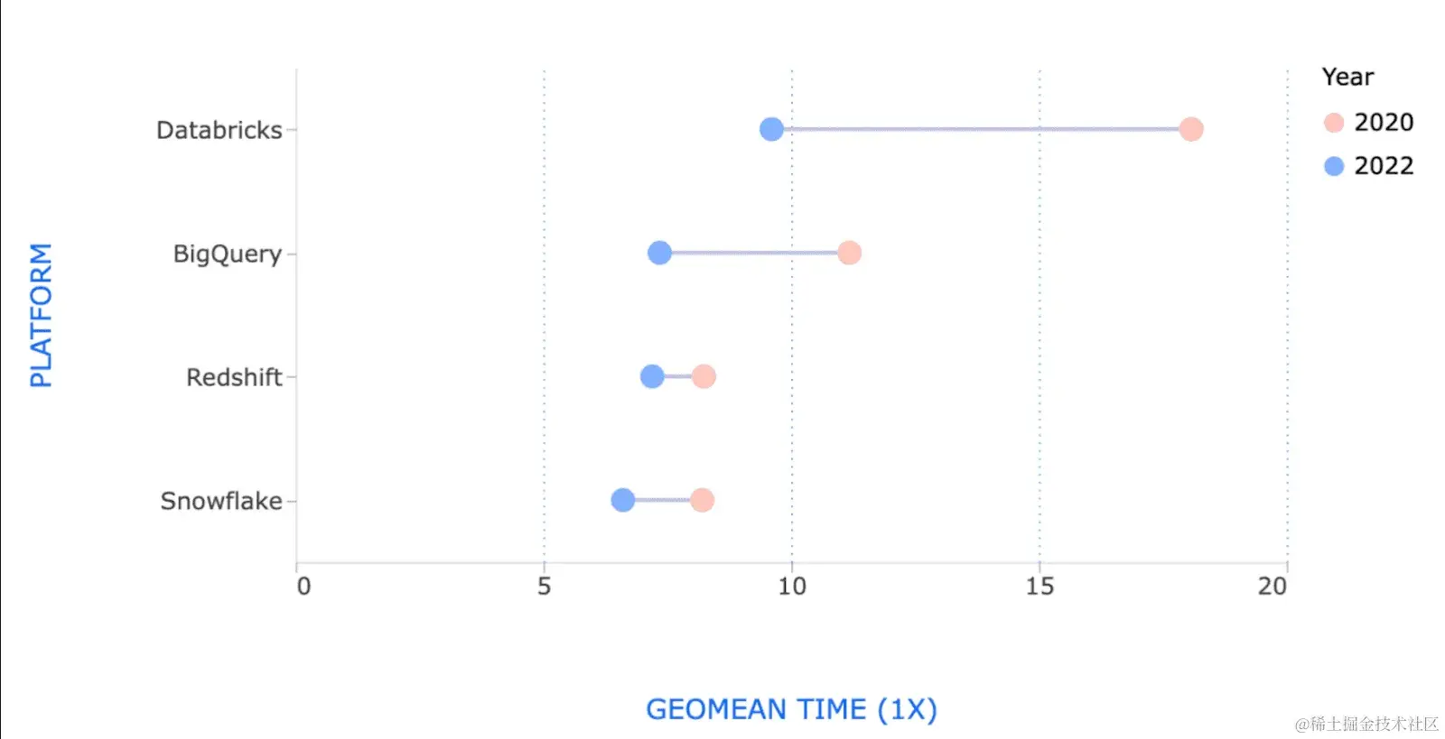 Fivetran 的首席执行官 George Fraser 发表了一篇有趣的文章,比较了主要数据仓库供应商随时间的表现;虽然 2020 年的分散程度相当大,但到 2022 年,它们会更加紧密地聚集在一起。2020 年最快 8 秒,最慢 18 秒,2022年有 3 家厂商在 7 秒左右,最慢 9 秒。