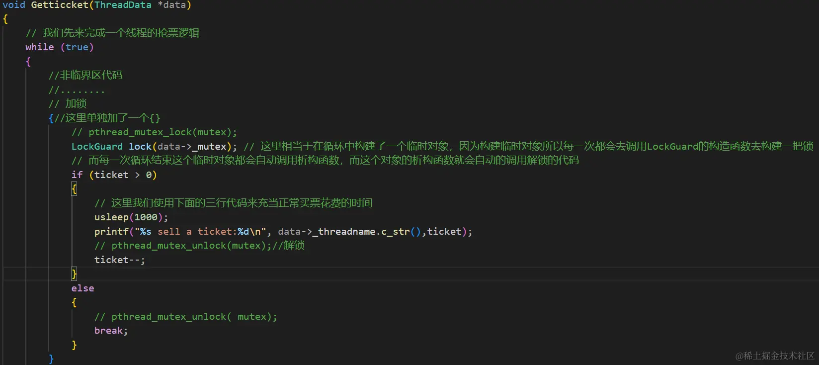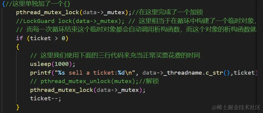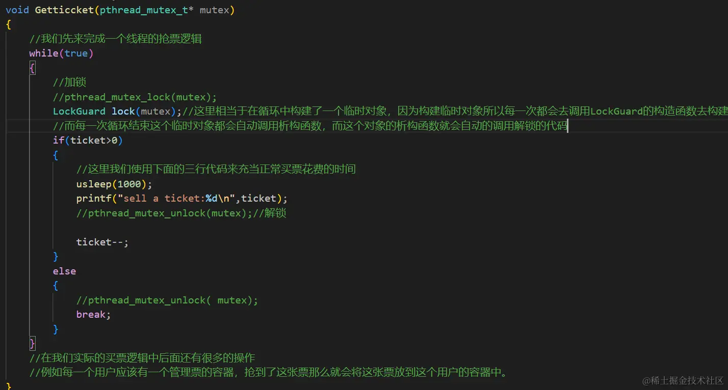 这里相当于在循环中构建了一个临时对象,因为构建临时对象所以每一次都会去调用LockGuard的构造函数去构建一把锁,而每一次循环结束这个临时对象都会自动调用析构函数,而这个对象的析构函数就会自动的调用解锁的代码。