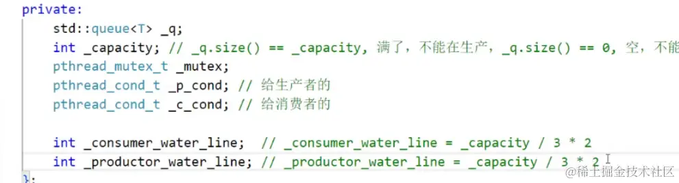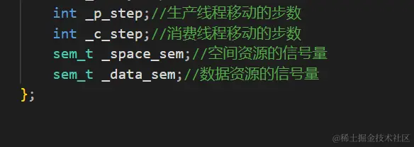 然后就是生产线程和消费线程在环形队列中移动,虽然生产和消费线程存在在同一个位置的可能性,但这也是少数,所以在类中还需要给生产和消费线程各自维护一个当前生产/消费线程移动到了哪一个步数的变量。同时这样才能做到在绝大部分情况中生产的同时还能消费。同时这两个变量也决定了当前的生产/消费线程能够访问的区域。然后就是两个信号量了。