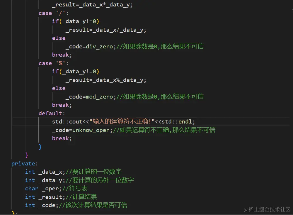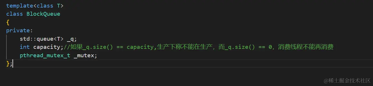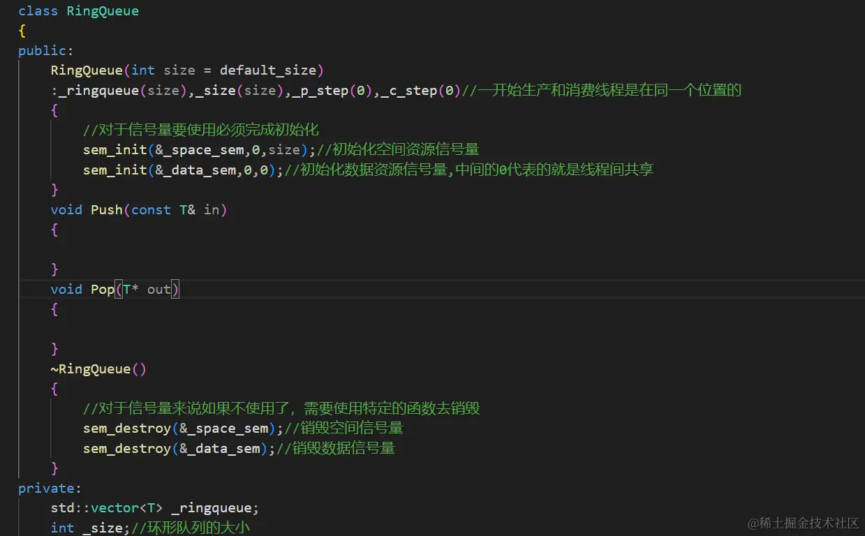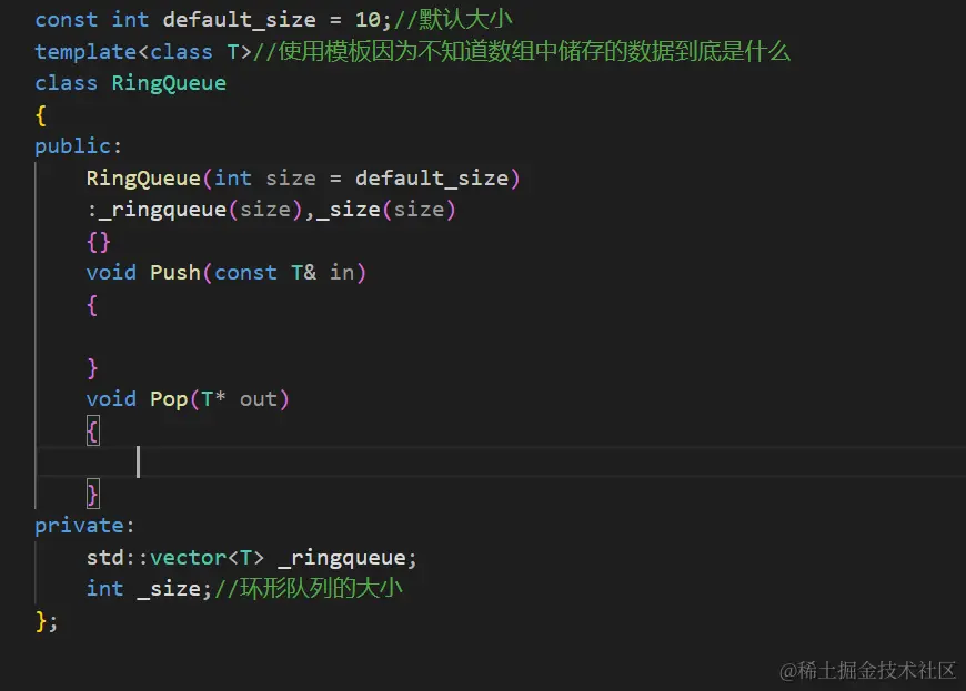 下面就来实现RingQueue这个类。因为这里的环形队列是使用数组来模拟实现的,所以这里需要一个数组的容器,并且这个容器最好也能和数组一样使用数组的方式去访问数据。这里就可以使用vector来当做数组了。因为并不知道这个数组中保存的数据是什么类型的数据所以需要使用模板。然后为了维护好环形队列最好有一个变量来记录这个环形队列的长度为多少。