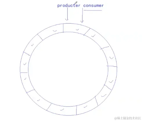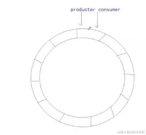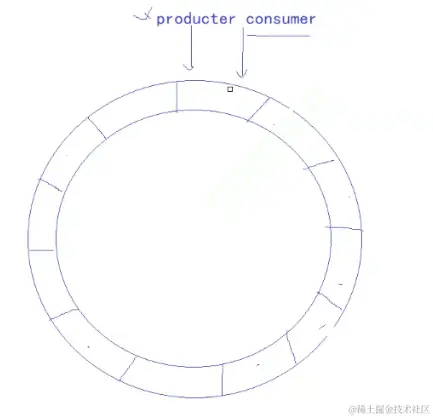 这里可以将生产者比作一个放苹果的人,环形队列就是一个圆形的桌子,而桌子上每一个空间只能放一个苹果,而消费者就是一个吃苹果的人,一开始生产者和消费者在同一个位置,生产者放苹果在生产者将苹果放满整个桌子回到和消费者同一个位置(消费者不动),就不能再放苹果了,因为没有空间了,而消费者一个一个的吃苹果(生产者不动),再将所有的苹果吃完回到和生产线程的同一个位置时,也不能再吃了,因为已经没有苹果了。但是实际的情况是,在生产者放苹果的时候,消费者也在一边吃苹果,在这场追逐的游戏中,生产者可能很慢,但是消费者也必须在生产者后面吃生产者放的苹果。如果生产者和消费者之间隔了几个苹果,在生产者放最新的苹果的时候,消费者能不能拿最后的苹果呢?答案是能。