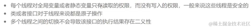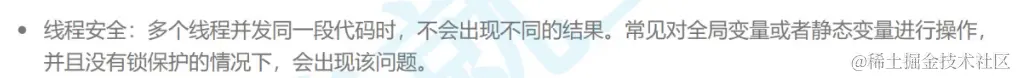 假设现在某一个线程在执行某一段代码的时候,代码要求这个线程对某些资源进行delete,可能影响了其它的线程让其他的线程直接崩溃了,这种导致线程出现问题或者线程进行的某种逻辑出现问题,称之为线程不安全。而在多线程进行并发访问的时候,不会影响到其它的线程,或者是崩溃,数据不一致等等的问题。我们就称之为线程是安全的