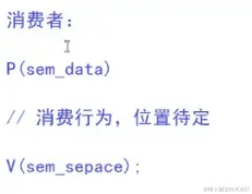 然后消费者要进行消费行为首先也需要对信号量进行申请,申请成功才会继续往下执行,而当消费行为完成了,消费者在V的时候。将某一个空间中的数据取走,此时空间就出来了,所以消费者V的就是sem_space。