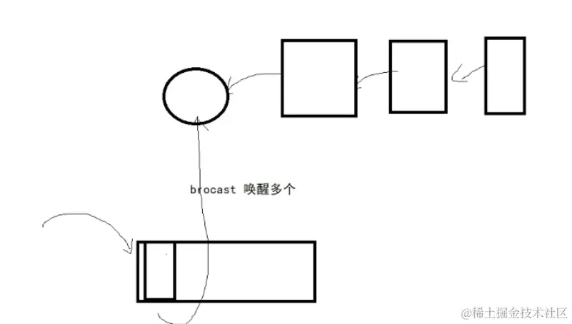 下面转换到消费线程的视角,现在生产线程已经准备好了一堆的数据,然后生产线程遵守规则不在生产了而是等待消费线程去消费数据。
