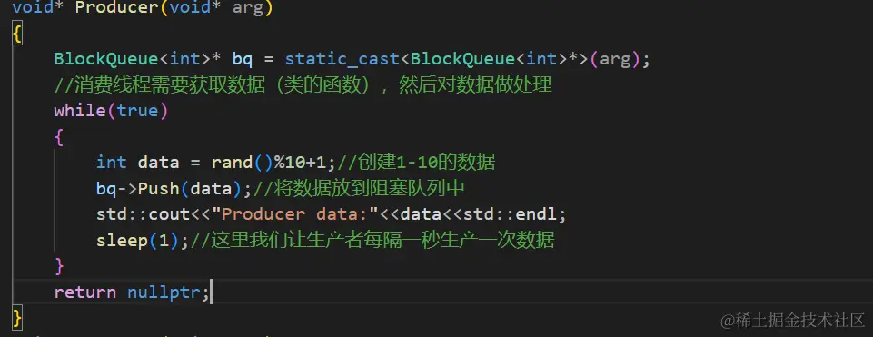 当生产完成之后,生产者要做V操作。当生产线程生产完成退出这个位置之后,这个空间依旧是被占用的。但是此时数据资源就多了一个。所以生产线程在V的时候不V自己而是去V(sem_data),这就是生产者的逻辑。