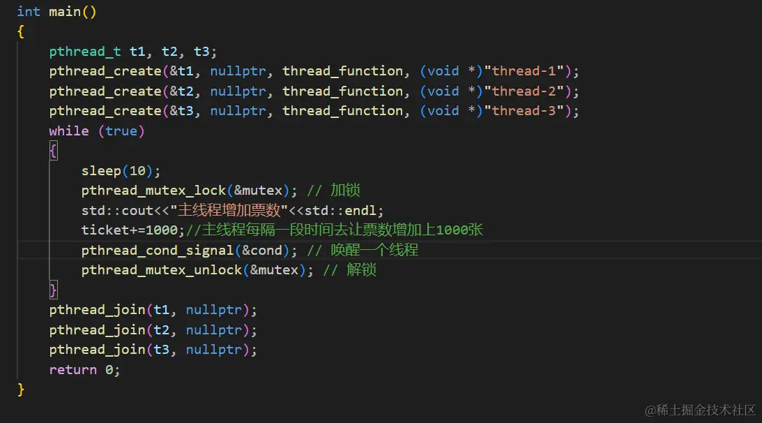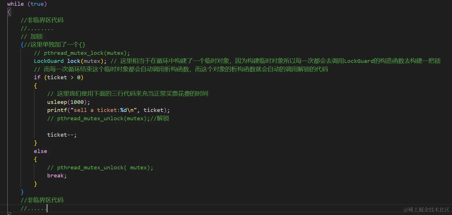 但是这样还有一个问题,如果我们的while循环中存在非临界区的代码,那么这些非临界区的代码也会被加上锁,那么要怎么做呢?这里我们可以增加一个{},来代表临界区。