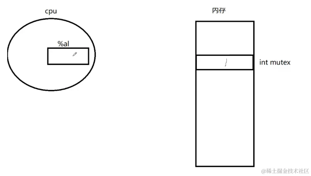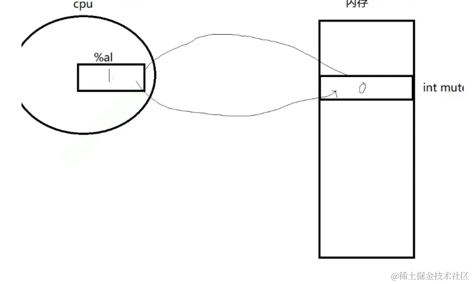 然后我们的第一个线程来申请了,这个线程会将0值写到cpu的寄存器中,