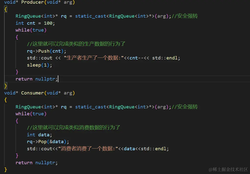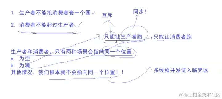 如果这个环形队列的背后只是指针的话,套完一个圈之后海继续运行的情况几乎是没有的,但是不要忘了这里的生产者和消费者是线程啊,如果不对线程加上限制是会出现套完一个圈了还继续往下运行的情况的。