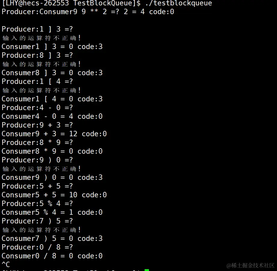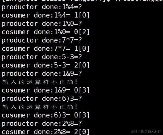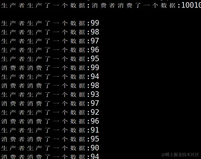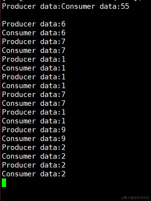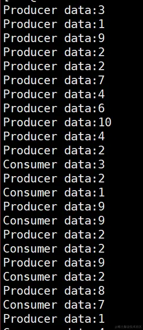 除了一开始出现了一些打印错误,在后面都是生产一个数据消费线程就消费一个数据,因为生产线程生产数据慢一些,而消费线程消费数据是快一些的。就会出现生产一个消费一个的现象。