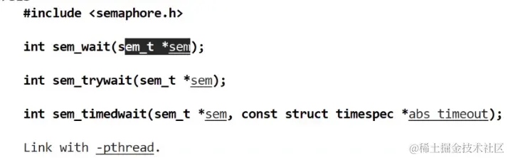 第一个sem_wait就是申请对应信号量的值,如果存在信号量那么这个函数就会返回,如果申请失败了,就会阻塞在这个函数处。当然也有非阻塞的版本上图中的第二个函数,以及按照时间阻塞的函数(第三个函数)。这里就只说明第一个函数了