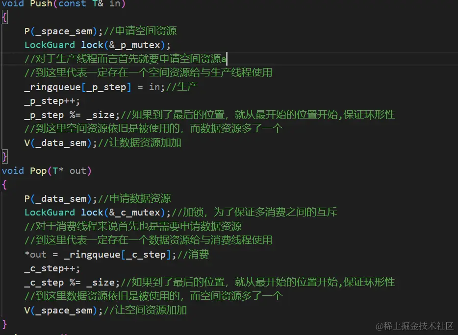 在生产之前,需要进行P操作,申请空间资源,有空间才能生产。申请成功了下面就是你要生产的位置了,位置自然就是在_ringqueue[_p_step]这个位置了,生产完成之后,让_p_step++。为了保证环形的特性还需要模上size。最后再对数组资源进行V操作。