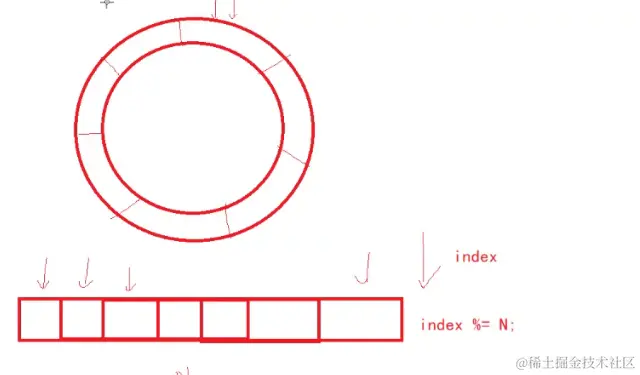 环形队列也就是通过取模的方式实现的,数组下标越界后的重新回到开头。