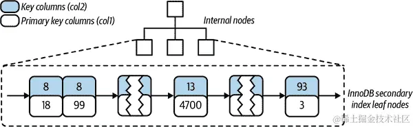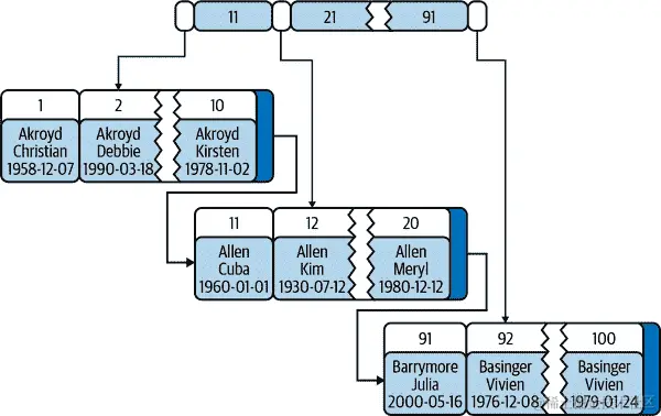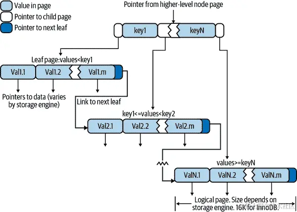 ² 许多存储引擎实际上使用 B+树索引,其中每个叶节点包含指向下一个节点的链接,以便通过节点快速进行范围遍历。请参考计算机科学文献以获取 B 树索引的详细解释。