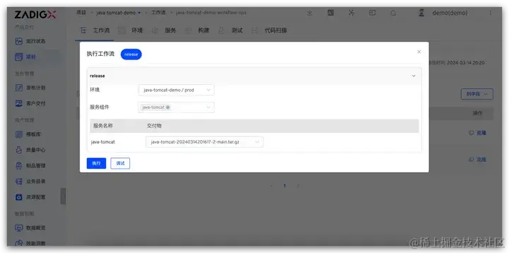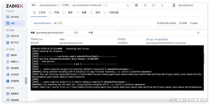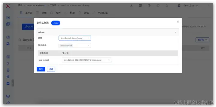 开发工程师代码实现完毕后需要测试联调时,执行 java-tomcat-demo-workflow-dev 工作流,选择对应的代码信息,自动执行构建部署过程。
