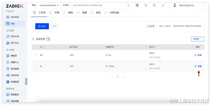 如果生产发布的版本出现异常,可以通过访问 java-tomcat-workflow-ops 工作流历史列表页面,选择先前的发布任务,然后点击“克隆”任务来快速进行版本回滚。