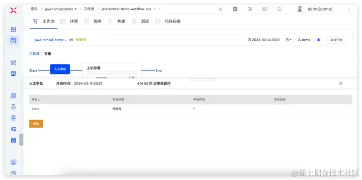 版本验证通过后,发布工程师执行 java-tomcat-workflow-ops 工作流,选择对应版本进行自动化发布。鉴于生产发布的严肃性,需要相关责任人对发布内容进行审批,审批人员可以通过 Zadig 工作流任务信息详细了解本次任务的具体改动,来保障发布内容的正确性和可靠性。