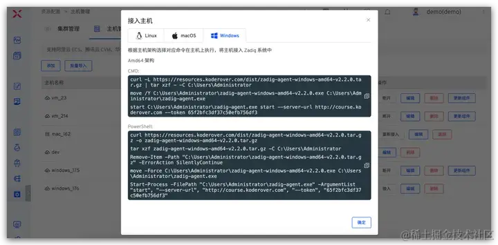 2. 在 Windows 主机上安装 Zadig Agent。根据主机的实际系统和架构选择对应的命令在主机上执行。