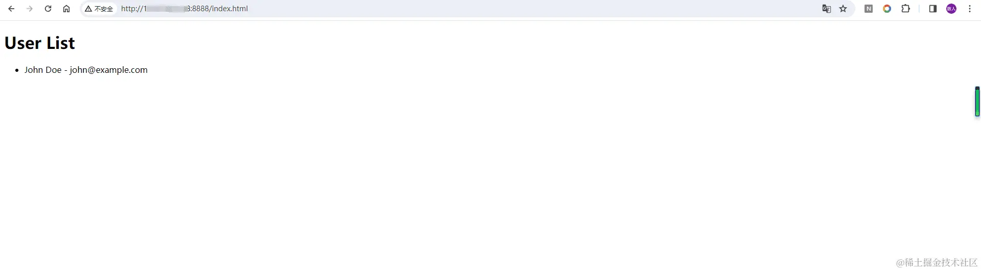 请注意,以上代码中的 your_mysql_username 和 your_mysql_password 应该被替换为你的 MySQL 数据库的用户名和密码。同时,demo_db 应该是你创建的 MySQL 数据库名,并且其中包含了 users 表来存储用户信息。如果你的 MySQL 配置和数据库结构正确,当你在浏览器中打开 index.html 页面时,应该能够看到从数据库中获取的用户列表显示在页面上。