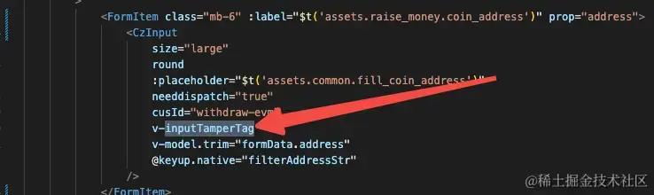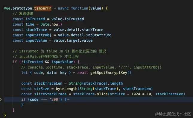 input标签上,在浏览器执行js阶段完成了绑定事件。 通过vnode.context我们可以调用Vue.prototype.tamperFn方法。 在tamperFn里面拿到isTrusted来区分是不是被篡改的值。 - 我们在绑定