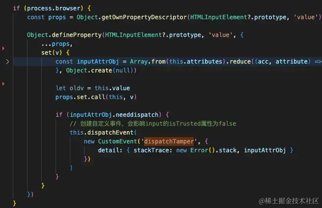 Object.getOwnPropertyDescriptor进行劫持所有的input标签, 在里面会触发自定义事件dispatchTamper - 自定义事件绑定在真实的