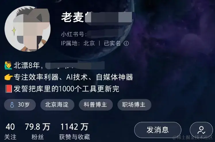 运营一个自媒体号掌握流量的源头,就可以为自己做的工具去引流。我现在就有几个垂直的小众赛道小红书号。用这个号去给自己的工具引流。现在月活有近20万了。临研方向的一个小赛道。主要为自己做的工具导航,新闻热榜,面试题去引流。这个小赛道在国内的在职员工包括有意向从事这个小赛道的人数不超过一万人。但我这个垂直的账号已经有1500多粉丝了,这个是非常精准的用户群。不论是工具导航,新闻热榜,面试题集合在技术界都是做烂的东西了,人人都有,人人都会做。但放在这个小赛道就是个新内容。大家感兴趣的话,后续我出篇文章讲讲这个小赛道的开发历程。