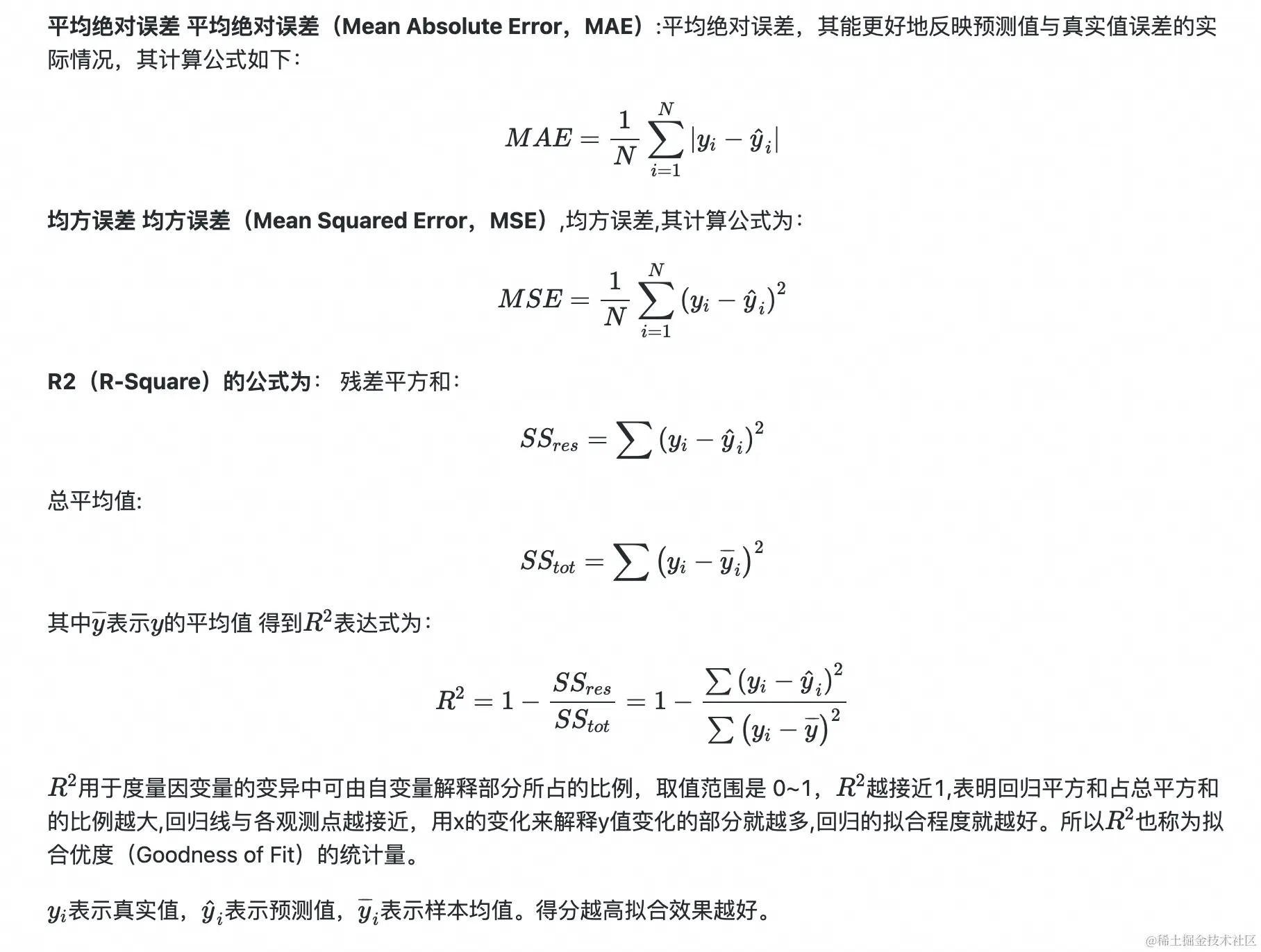 - 平均绝对误差(Mean Absolute Error,MAE),均方误差(Mean Squared Error,MSE),平均绝对百分误差(Mean Absolute Percentage Error,MAPE),均方根误差(Root Mean Squared Error), R2(R-Square)
