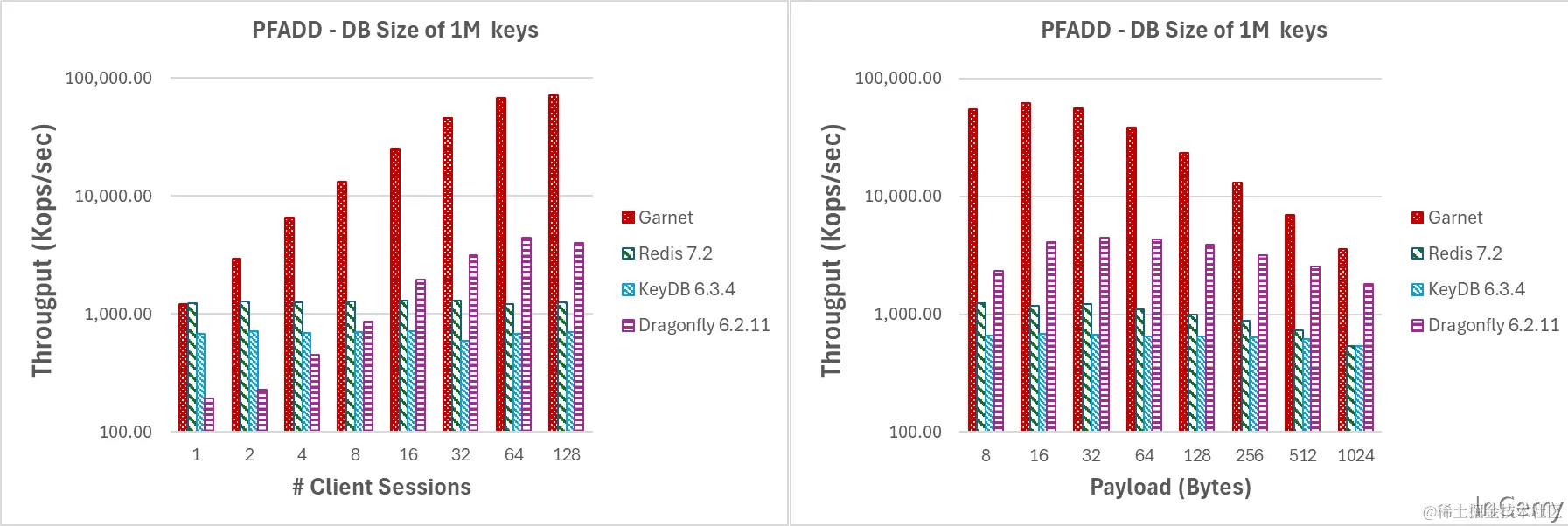 图 6:数据库大小为1M个键时,(a)客户端会话数量增加,(b)有效载荷大小增加的吞吐量(对数刻度)。