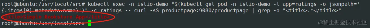 kubectl exec -n istio-demo "$(kubectl get pod -n istio-demo -l app=ratings -o jsonpath='{.items[0].metadata.name}')" -c ratings -- curl -sS productpage:9080/productpage | grep -o "<title>.*</title>"
