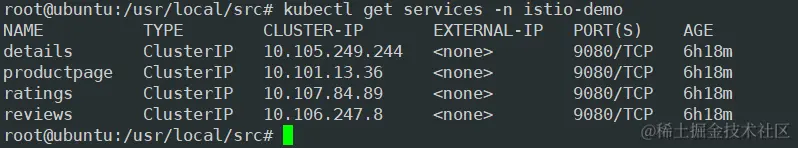 - 使用 kubectl apply 命令部署 bookinfo.yaml 文件,该文件位于 istio 的 /usr/local/istio/samples/bookinfo/platform/kube 目录下。