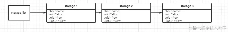 例如storag_list->"threshold 20字节 mallco free"->"test 8字节 myalloc my free"->... ...