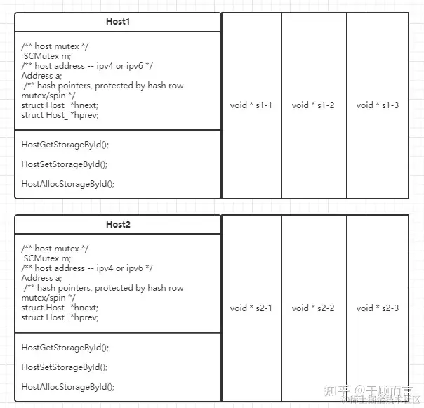 数据区的真实创建需要用到下面的结构体Host,我理解它是一种钥匙,上电时会预分配一些host对象,创建host对象时,并非只分配sizeof(host),而是多分配出若干个void *,这个数量和注册storage数据区一致。后面这个host通过偏移sizeof(host)+id,这样就能找到各个数据区了,每个host都会分配自己的数据区,彼此不干扰。因为,Host对象是加锁的,所以取得host时会有HostGetHostFromHash和HostRelease的操作。