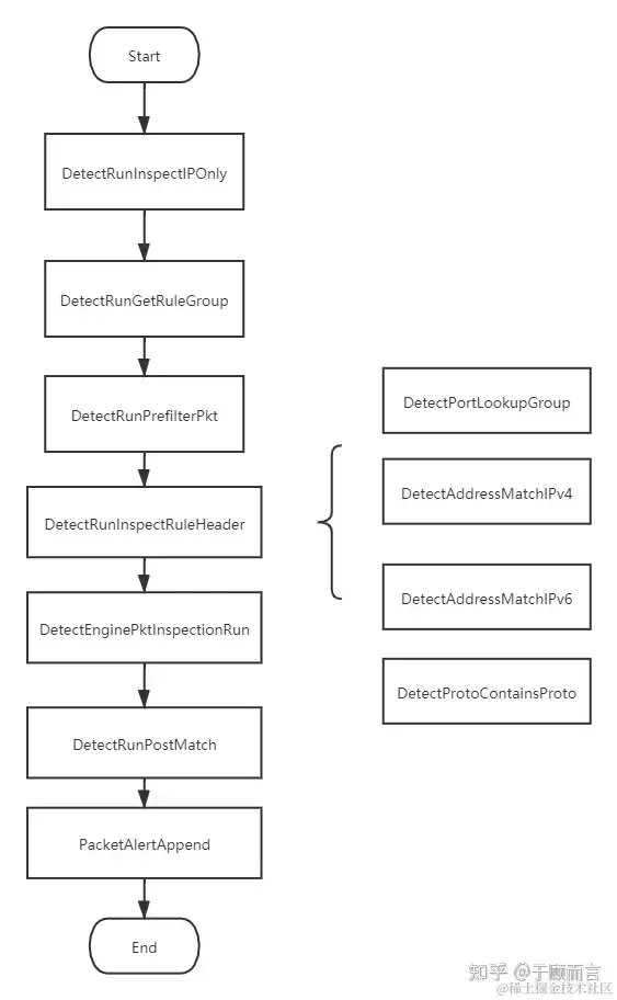 其实规则的匹配流程和加载流程是强相关的,你如何组织规则那么就会采用该种数据结构去匹配,例如你用radix tree组织海量ip规则,那么匹配的时候也是采用bit test确定前缀节点,然后逐一左右子树查询,Suricata也是如此,让我给大家简单介绍一下匹配流程。