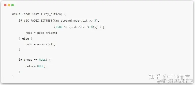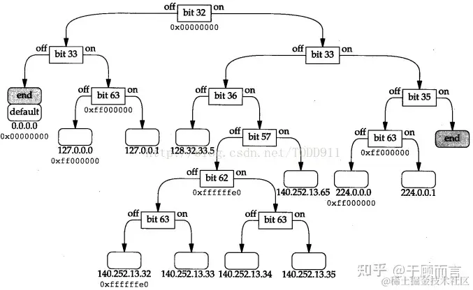 这里面suricata借鉴了BSD操作系统中路由表查找算法-Radix Tree,路由表查找本质就是对目的ip进行 最长掩码匹配,而索引到路由表中的下一跳。那么,我们先看看radix tree的基本思想。