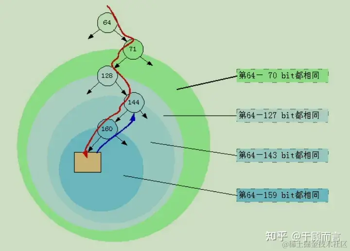 - 公共相同掩码切分,看下面这个图比较好理解,旧节点和新节点第一次不一样的地方是148: