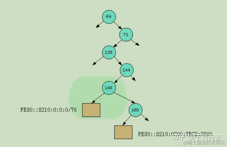 - 如果第一步骤精确匹配不到,则在这个叶子节点的重复键链表中查找掩码匹配的可能,掩码是按从大到小进行排列:192.168.0.0/16和192.168.0.0/20