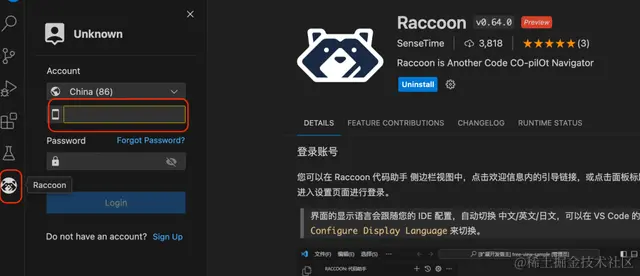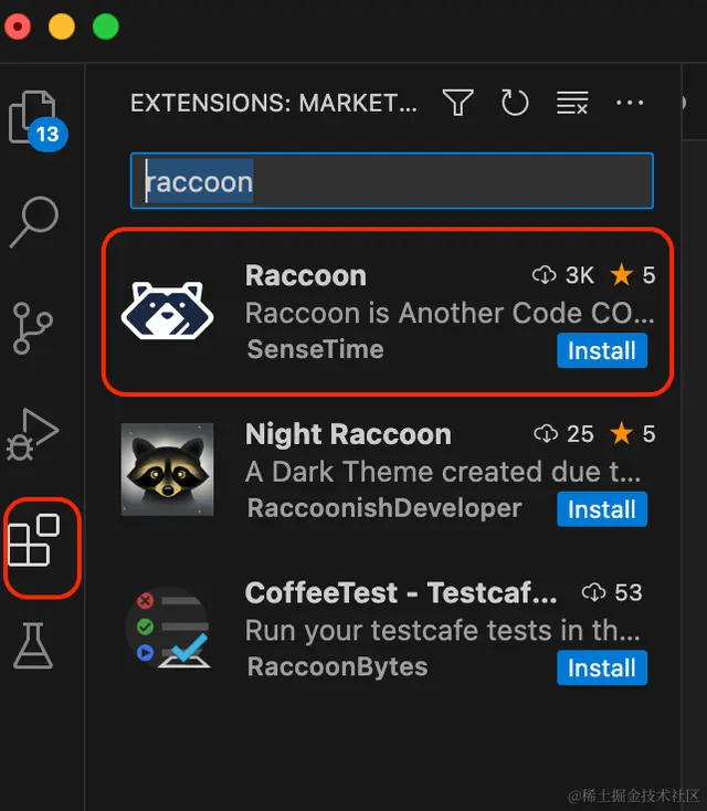 我们选择主要的vscode 来进行深入体验一下吧,在vscode的应用市场直接输入raccoon ,选择白黑色的小浣熊图标进行安装即可。