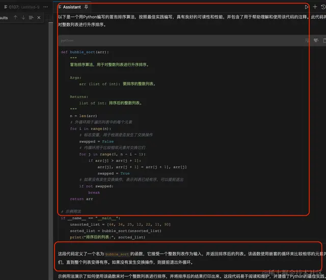 在右边的编程助手的对话框里面,输入“给我写一个python的冒泡算法”,看看这个智能助手手艺如何: